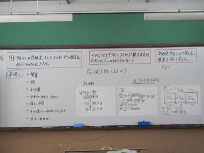 96÷32の商がどのようになるのか,答えの出し方を考えました。学級で考えを出し合うことで,どのように計算すればよいのか,考えが深まりました。