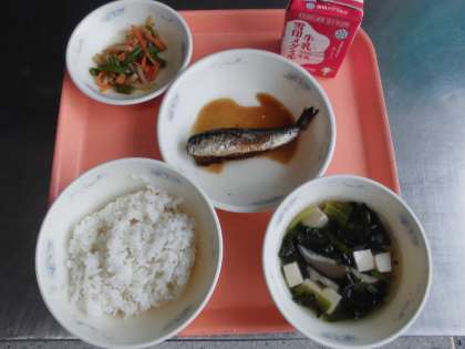 麦ごはん・牛乳・いわしのかわり煮・野菜のきんぴら・とうふの吉野汁