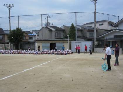 保護者やPTAの方々にお世話になり,たくさん集まったベルマークで,一輪車8台を購入していただきました。ベルマークをたくさん集めることで,全校に学校で使えるものが増えることを紹介しました。