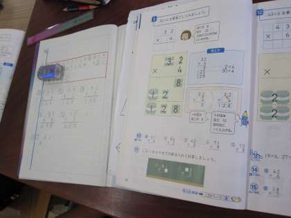2けた×1けたの筆算の仕方を学習しました。筆算の途中の計算の意味を理解し,練習問題に取り組みました。