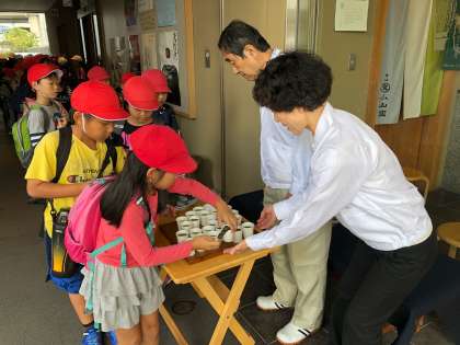見学後に,お茶団子とお茶をいただいています。