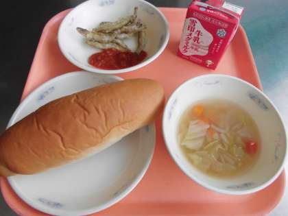 味付けコッペパン・牛乳・わかさぎのからあげ トマトソースぞえ・野菜のスープ煮