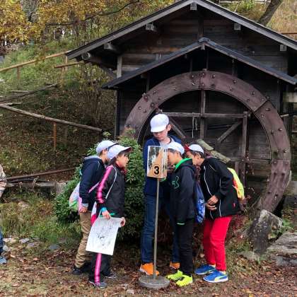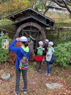 水車の前のチェックポイントをグループで次々に通過していっています。