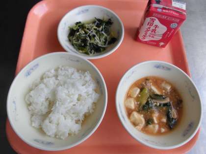 ごはん・牛乳・とうふの四川風・ほうれん草ともやしのいためナムル