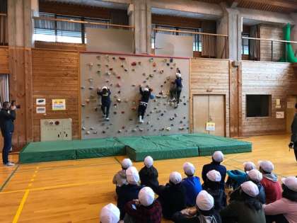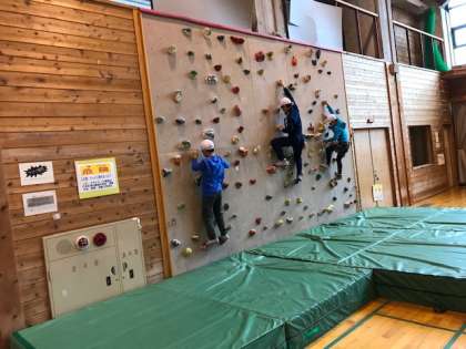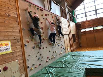 4日目の活動,ボルダリングが始まっています。準備体操で手足を伸ばした後,3メートルの壁に挑戦しています。3点支持でゆっくりゆっくり慎重にしています。