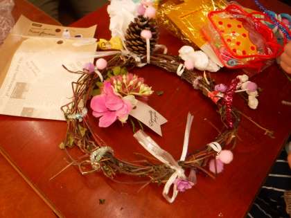 今日は,その時に集めた木の実や,家庭から持って来てもらったリボンやモールなどを使って,リース作りを行いました。