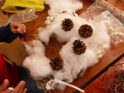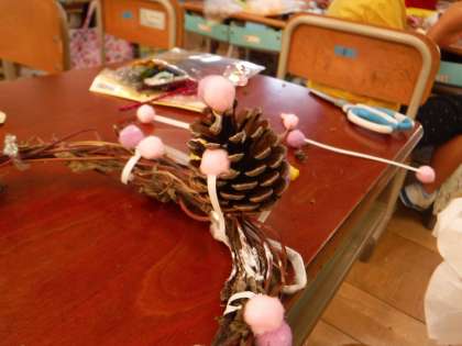 モールをうまく立てて立体的にしたり,木の実と組み合わせたり,来るクリスマスに合わせてイメージを膨らませたりと,楽しみながらの制作でした。
