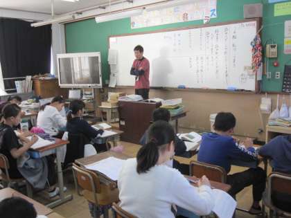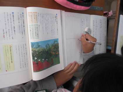 読み取ったことや感じたことをどのように表現していくのかについて学習しました。まずは,教科書の絵を見て,読み取ったことと感じたことに分けて,ノートに書きました。