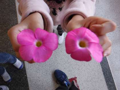 昼休みにはきれいなピンクのお花をもらいました。アサガオの種をくれたりと,子どもたちがたくさんの贈り物をしてくれます。