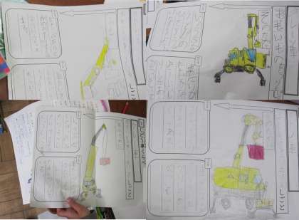 クレーン車のしごととつくりについてまとめました。しごととつくりの部分をしっかりと見つけていました。