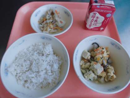 麦ごはん・牛乳・高野どうふの卵とじ・根菜のごまいため