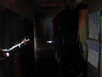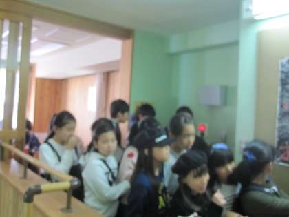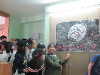児童館では,本校の卒業した中学生たちによるおばけやしきが行われています。こどもたちがたくさん並んで順番を待っています。