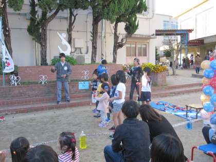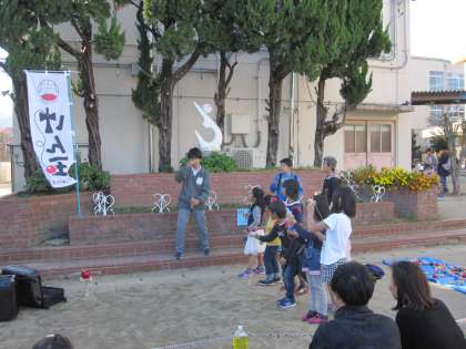 けん玉ショーでは,けん玉のすごい技を見せてもらいながら,子どもたちも一緒にけん玉をしていました。