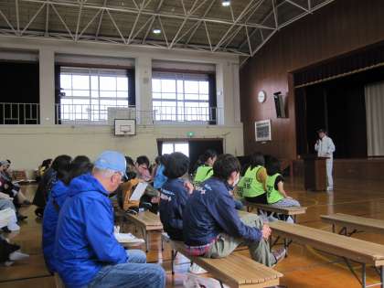 スタンプラリーの説明では,防犯・防災の視点で梅津のまちを歩きながら,スタンプラリーをしてもらうようお話がありました。