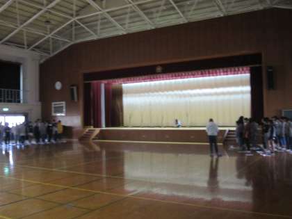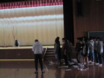舞台で,発表の練習をしています。位置や言葉のタイミングを確認しました。