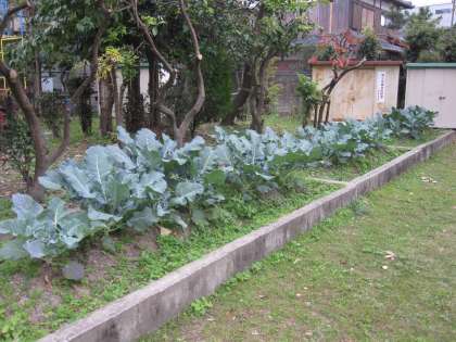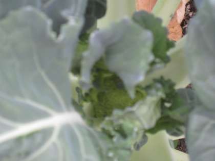 ブロッコリーがとても大きくなってきました。一番下のほうの葉が枯れてきていました。大きくなったブロッコリーの中には,中心に普段食べているブロッコリーのようなものができているものもありました。