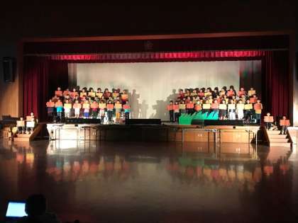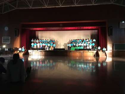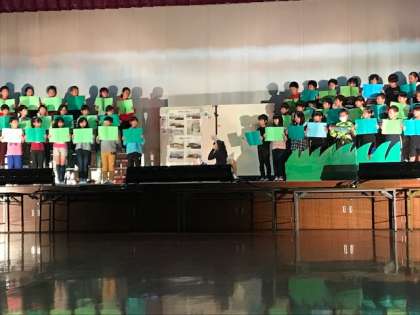 4年生,学習発表会の練習「ごんぎつね」。歌と言葉,そして,演技でお話を進めていきます。小道具も効果的に使い,情景を色で表しています。
