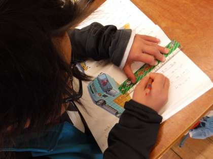 国語科では「自動車くらべ」の学習を進めています。この日は「トラック」の仕事と作りについて,教科書に線を引きながら読み進めました。