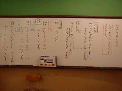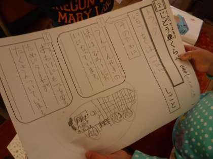 バスや乗用車での学習を参考にしながら,文章の構成を読み取り,ワークシートにまとめています。明日はクレーン車の学習の予定です。