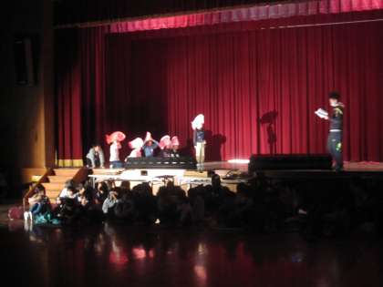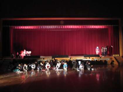 舞台での動きを確認しながら,練習をしています。気持ちを込めて,動きを交えながら発表することを頑張っています。