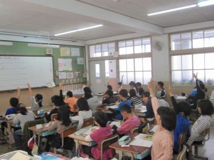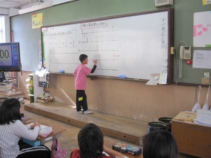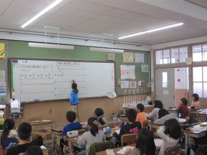 分数を数直線に表すと,どのようになるのかを学習しました。簡単なようで,分数の意味をしっかりと理解していないとよく間違える問題ですが,「1」の大きさを基準として数直線に表していました。