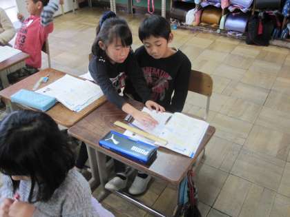 方眼紙を使って,三角形と四角形をかきました。決められた長さの長方形や正方形,直角三角形をかいて,ペアで確認することができていました。