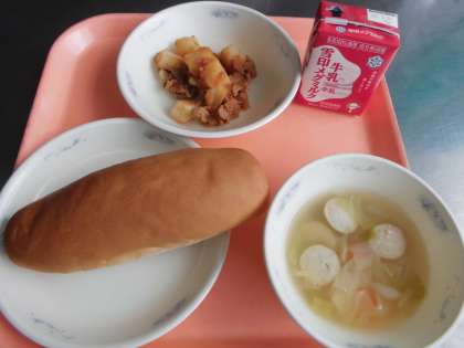 ミルクコッペパン・牛乳・豚肉のケチャップ煮・ソーセージと野菜のスープ煮