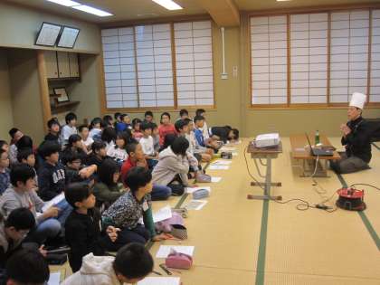 5年生の総合的な学習の時間で,「仕事」をテーマに学習をしています。今日は,パティスリーHiroyaの社長さんを迎えて,仕事のやりがいや大変さなどについて話していただきました。仕事の大変さを学校の様子と置き換えながら,子どもたちにわかりやすくお話しいただきました。