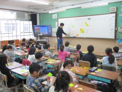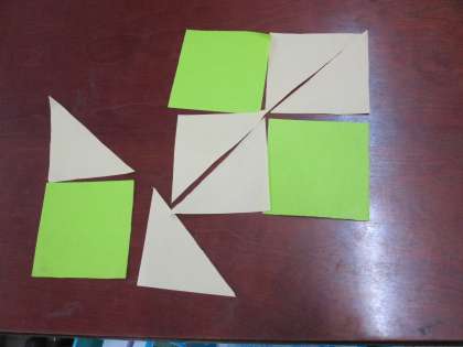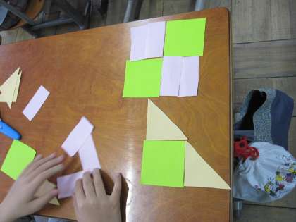 切った三角形や長方形,正方形を使って,形づくりをしました。それぞれの形の特徴を生かして,直角三角形や大きな正方形などを作ることができていました。