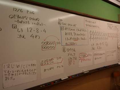 算数科ではいよいよ2学期の学習も大詰めになっています。繰り上がりのあるたし算,繰り下がりのあるひき算の学習も終え,最後の小単元に入っています。