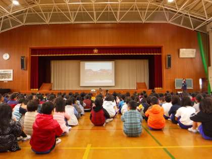 校長先生からは,世界がもしも100人の村だったら,というテーマでお話がありました。世界の人口75億人を,100人の村に置き換えると,百分率でその割合が分かる同名の絵本を活用したものでした。