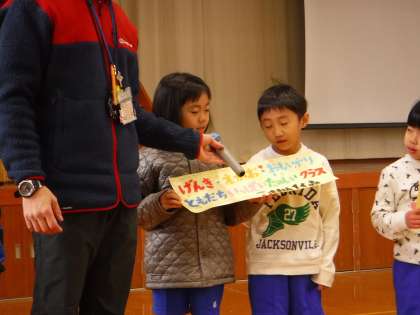 各学級からの人権標語の発表では,1年生も大きな声で伝えることを目標に発表しました。元気で笑顔に,声のかけあえる学級や学年であってほしいです。