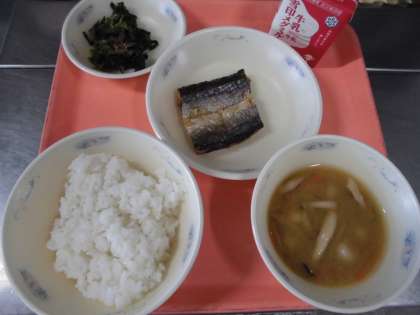 ごはん・牛乳・開干さんまのからあげ・ほうれん草のおかか煮・いものこ汁