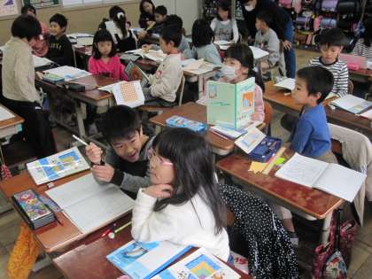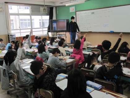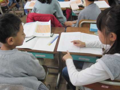 6×4になる式をどのように説明すればいいのかを考えました。ペアで図で表したものを指さしながら話し合い,全体でも交流して,説明の仕方について考えを深めました。