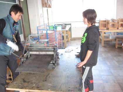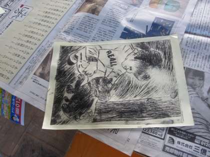 ドライポイントを使って,版画を進めています。機械を使ってすり上げていきました。