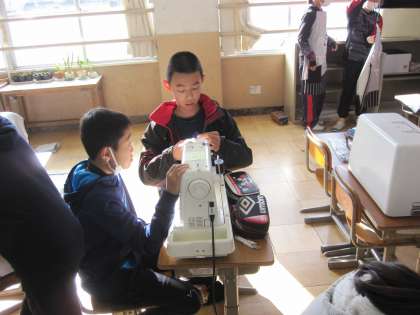 ミシンを使って,エプロンを作っています。友達とミシンの使い方を確認しながら学習を進めています。