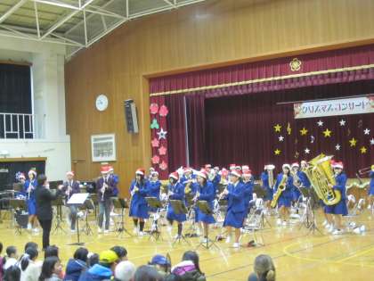 PTA主催のクリスマスコンサートが行われました。PTA会長,学校長からあいさつがあり,梅津中学校吹奏楽部の演奏がありました。吹奏楽部の演奏は,動きも入れながら演奏する楽しい発表でした。