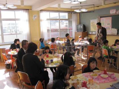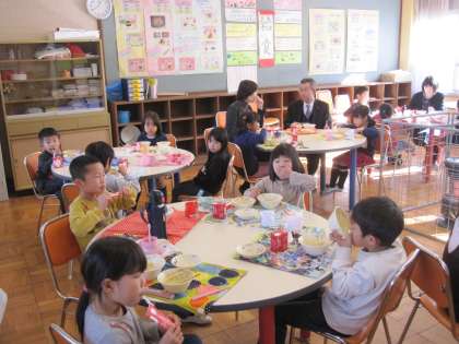 1年生2組がランチルームで,本日の給食を食べました。今日は,体育健康教育室の室長と専門主事が来られ,一緒に給食を食べました。