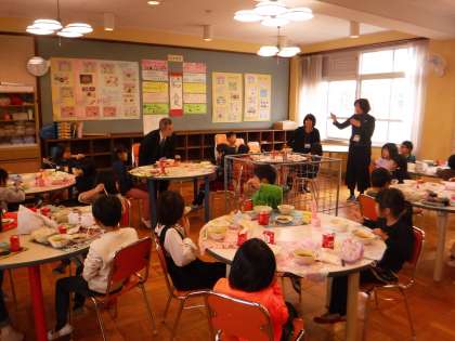 今日の給食はランチルーム。カレーを食べに来て頂いた教育委員会のお二人と一緒でした。1年生の元気な姿や雰囲気,給食大好きなところを見て頂けて,良かったのではないかと思います。子どもたちも大喜びでした。