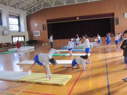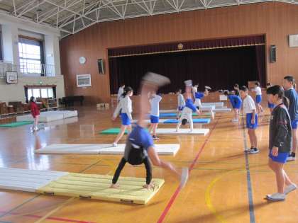 6年生はマット運動で側転の練習をしていました。脚が伸びているかどうか,友だちどうしで助言をしていました。