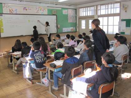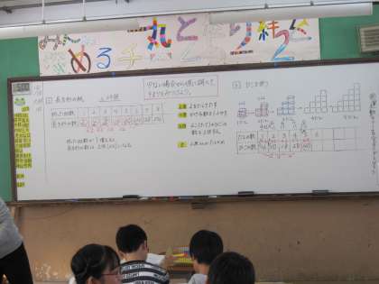 5年生算数では,伴って変わる2つの量について,変化のきまりを見つけるために表に表し,見つけたきまりを基に多い場合の数を求めるという問題に取り組んでいます。しっかりと考えたことを表現できる5年生です。