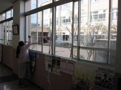 蜘蛛の巣がはって汚れた窓をきれいにするために,一生懸命に掃除をしています。掃除した後の窓は,ぴっかぴかになりました!