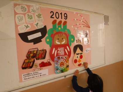 5校時に冬休みの図書を返却に行くと,図書室前の掲示が新年のものに変わっていました。早速福笑いを見つけた子は,完成させようと楽しんで触っていました。