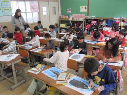 版で刷ったものにコンテなどで色を付けました。動物の周りの様子が伝わるようにコンテで背景を色付けたり,クレパスで描き加えたりしました。