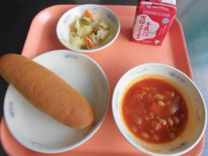コッペパン(国内産小麦100%)・牛乳・大豆と鶏肉のトマト煮・野菜のホットマリネ