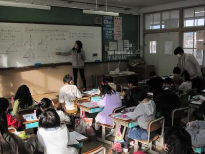1つの三角形から 1.2つの三角形に分ける方法 2.1つの三角形と1つの四角形に分ける方法を考えました。1つの頂点から辺に向けて直線を引くと2つの三角形になり,辺と辺の間に直線を引くと三角形と四角形に分かれることを学習しました。