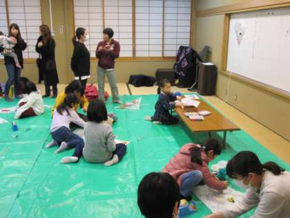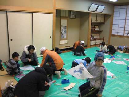 明日は凧あげ大会が行われます。今日は地域やPTAの方々による凧づくりが,ふれあいサロンで行われました。アドバイスを受けながら,描いてきた凧に骨組みを組んで立派な凧を作り上げていました。高く上がりそうな凧ができあがりました。,