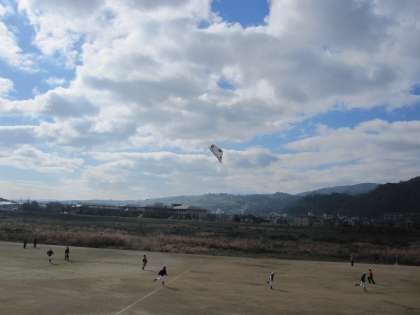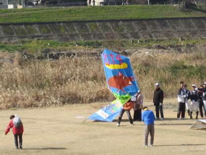 梅津中学校の生徒たちが引っ張って,大凧をあげてくれました。凧によって,高くあがったり,ゆれながらあがったりしていました。高く凧が上がると歓声と拍手がわきおこりました。