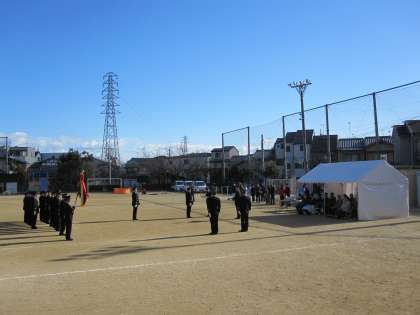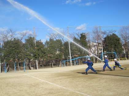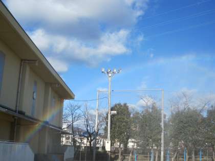 新しい年を迎え,晴天のもと,本校の運動場で出初式が行われました。式典の後,放水訓練が行われました。放水されたところには,きれいな虹がかかりました。