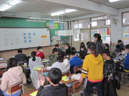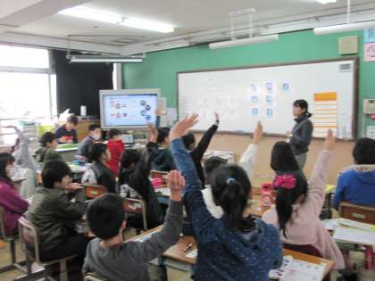 得意なことを表現する英語"〜good at 〜"に慣れ親しみました。新しい表現方法を使って,職業あてのクイズをしました。